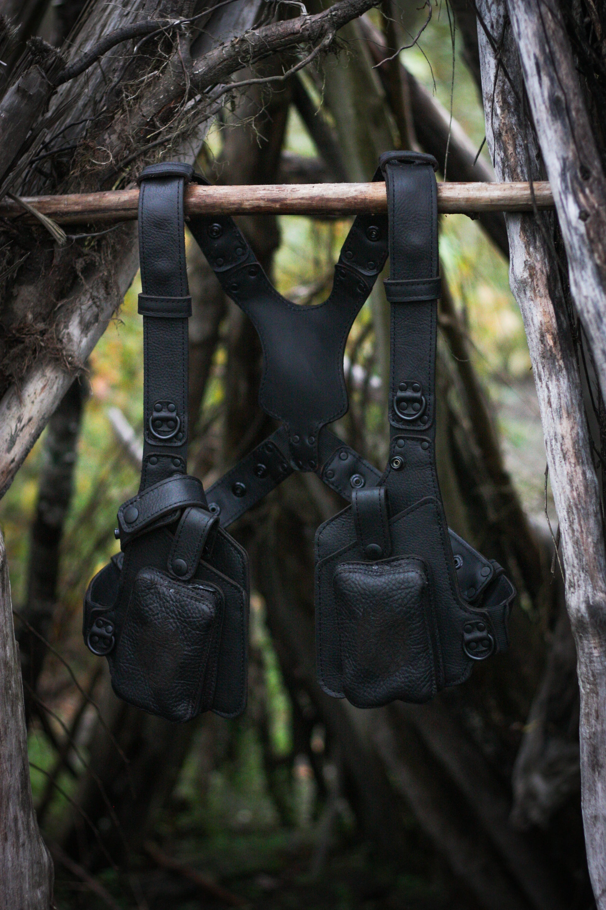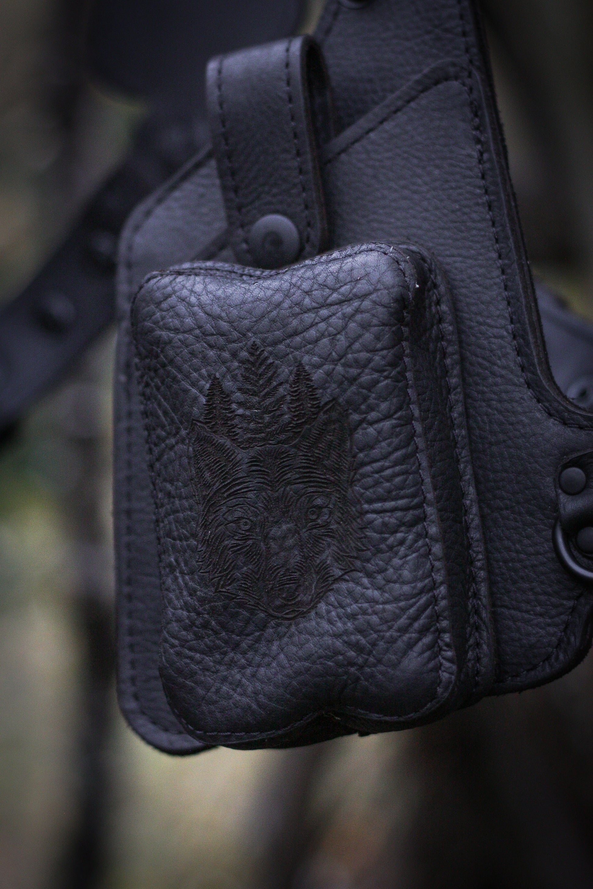 Minimal style leather holster featuring adjustable straps, “anti-g” elastic joints, modular pockets, solid brass enamel covered hardware, multiple d-rings/attachment points, inner card pocket, inner stash pocket, passport pocket and signature wolf engravings.