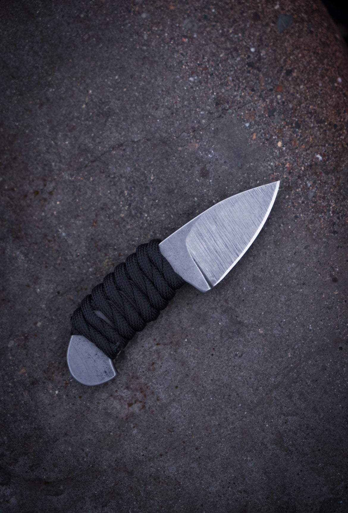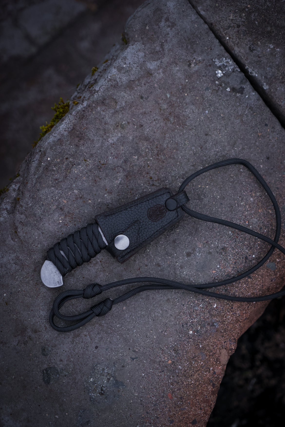 Small necklace knife handmade from high carbon steel, comes with an adjustable lanyard and leather sheath.